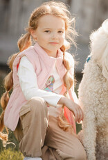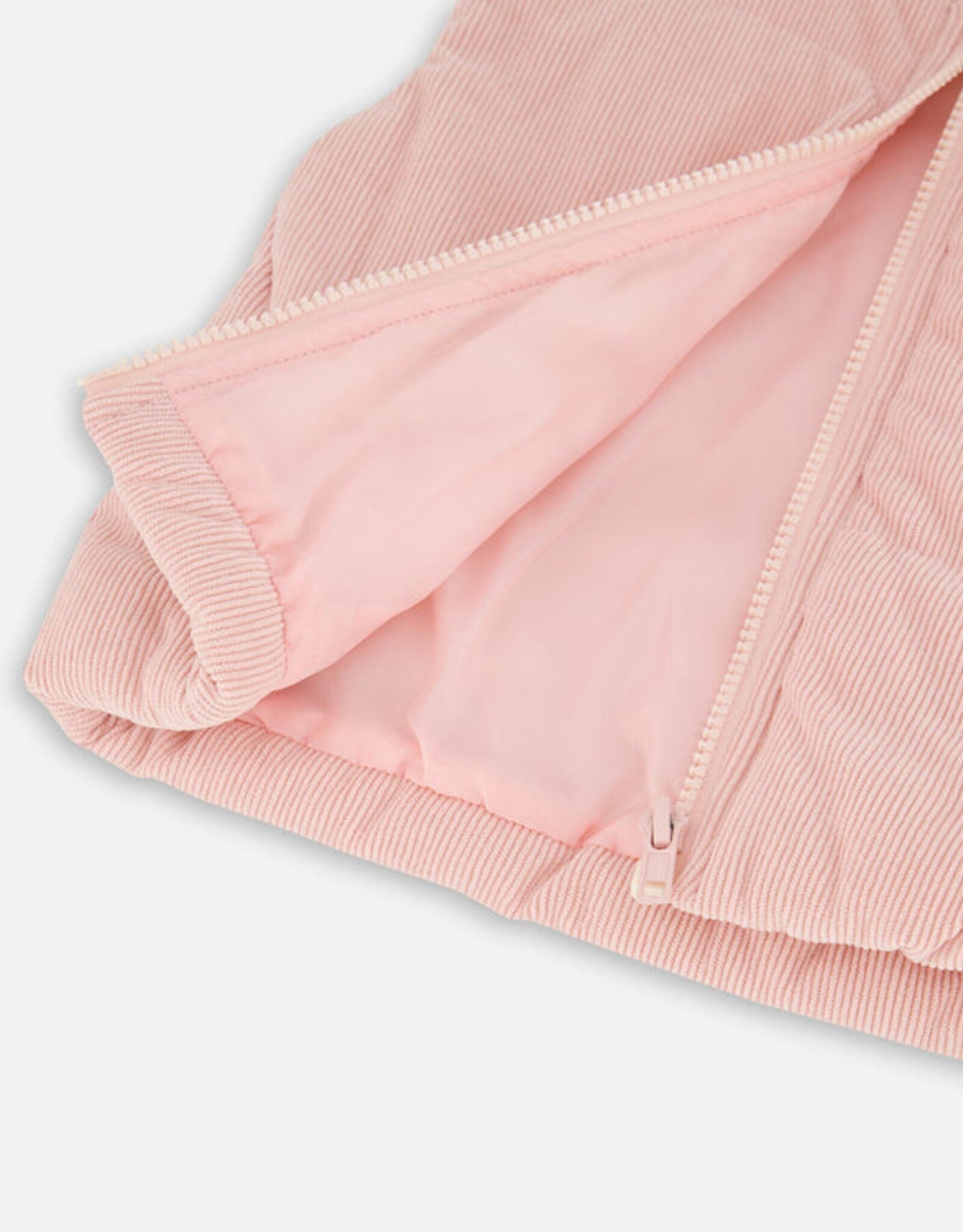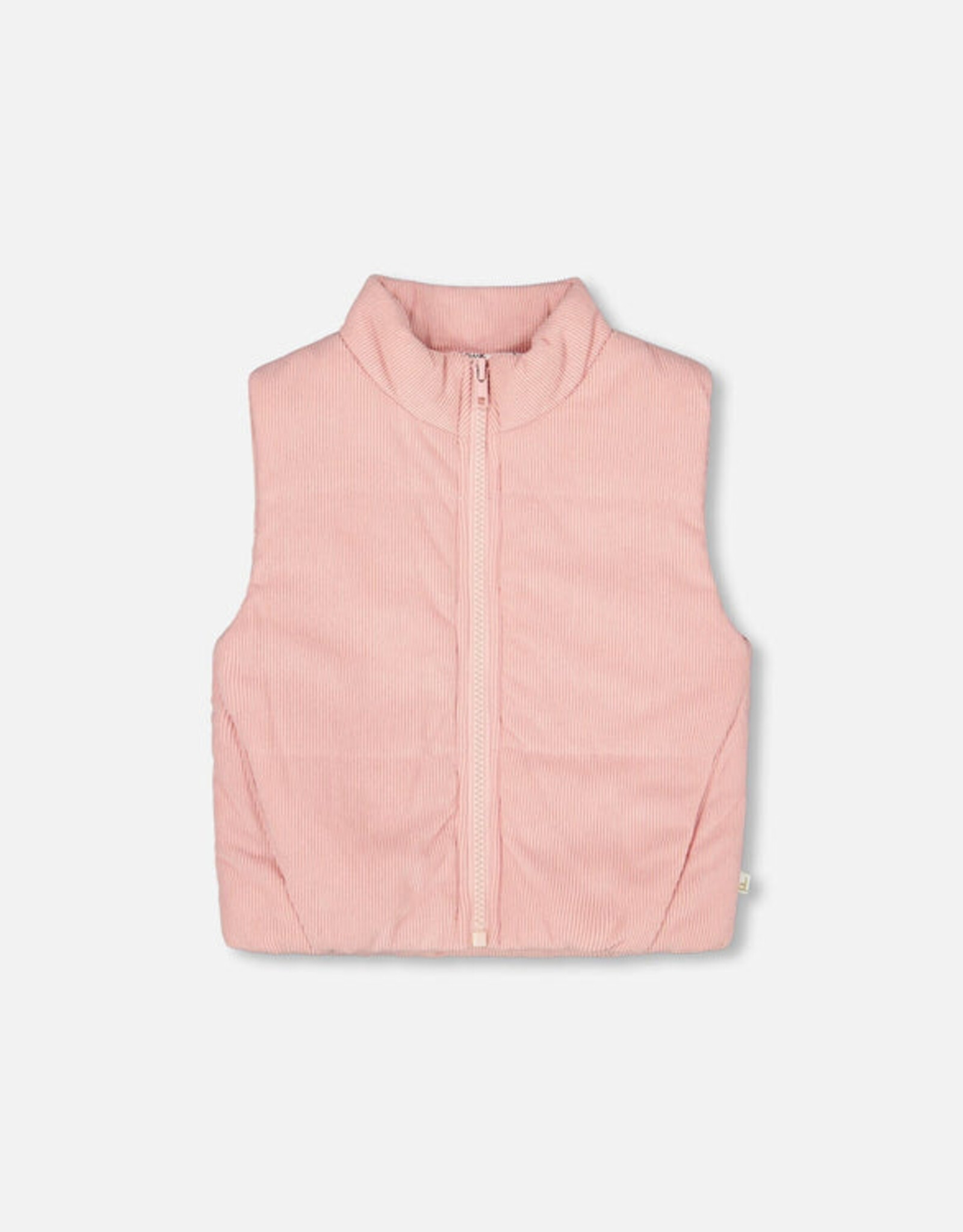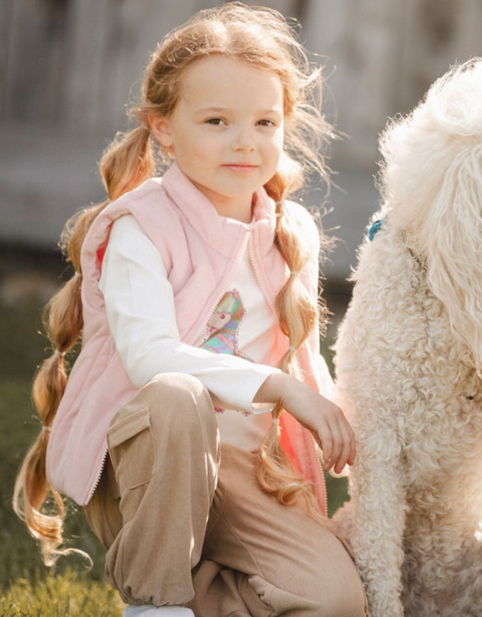 Cozy and stylish, the dusty pink corduroy sleeveless quilted jacket is perfect for chilly days. Crafted from soft corduroy with light padding, this sleeveless jacket features a protective stand-up collar, a front zip fastening, and a gently gathered elasticated hem. This jacket is perfect over a T-shirt, knit sweater, or dress from the "Lamas en folie" collection.